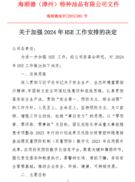 為認真落實習(xí)近平總書記關(guān)于做好安全工作的指示、批示精神,筑牢安全防線。公司安全生產(chǎn)委員會于2023年12月20日組織召開了做好2024年HSE工作的討論會,旨在對公司2024年的HSE工作進行頂層設(shè)計,避免安全工作的隨機化和碎片化管理。對討論會上提出的意見或建議進行完善或修改后,2024年元月2日下發(fā)了海順德(漳州)特種油品公司《關(guān)于加強2024年HSE工作安排的決定》。決定明確了公司全年的HSE目標(biāo)及落實企業(yè)安全生產(chǎn)主體責(zé)任、強化直接作業(yè)環(huán)節(jié)安全管理、事故責(zé)任追究等15項主要工作。